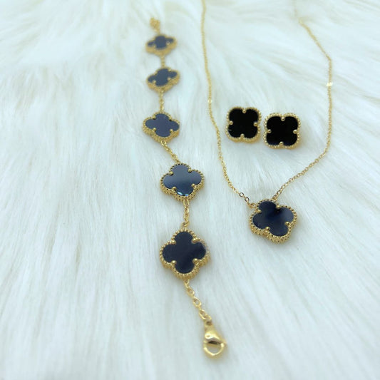 Four Leaf Clover Necklace Bracelet and Earrings Set Black